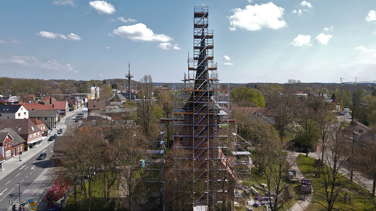 Kirche Bad Bramstedt Projekt Details Auftraggeber:Ort: Bad Bramstedt Gerüstfläche:Bauzeit: 2022 Gerüstsystem: PERI UP EASY – Fassadengerüst, PERI UP FLEX – Modulgerüst